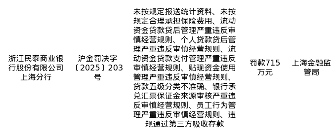 罚单败露,浙江民泰营业银行股份有限公司上海分行的主要违法违法动作是:未按法规报送统计贵寓、未按法规合理承担保障用度、流动资金贷款贷后措置严重违抗审慎经营法规、个东谈主贷款贷后措置严重违抗审慎经营法规、流动资金贷款支付措置严重违抗审慎经营法规、贴现资金使用措置严重违抗审慎经营法规、贷款五级分类不准确、银行承兑汇票保证金开首审核严重违抗审慎经营法规、职工动作措置严重违抗审慎经营法规、违法通过第三方汲取入款。